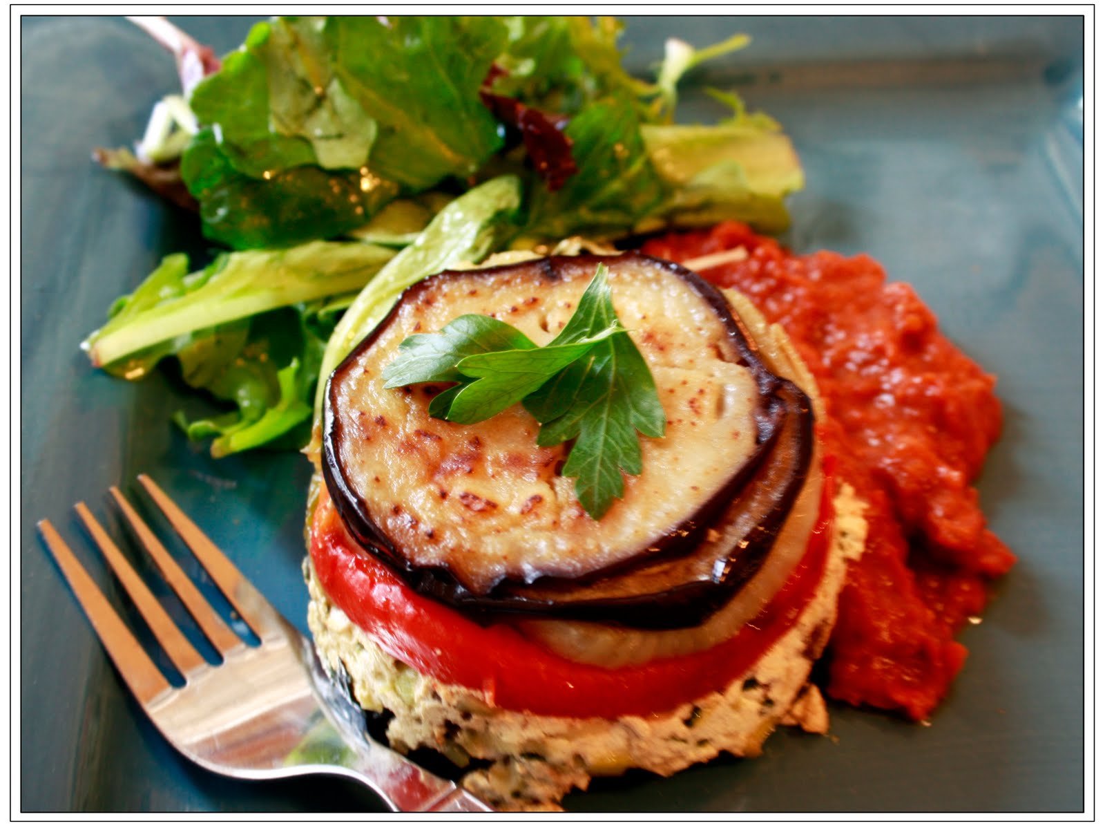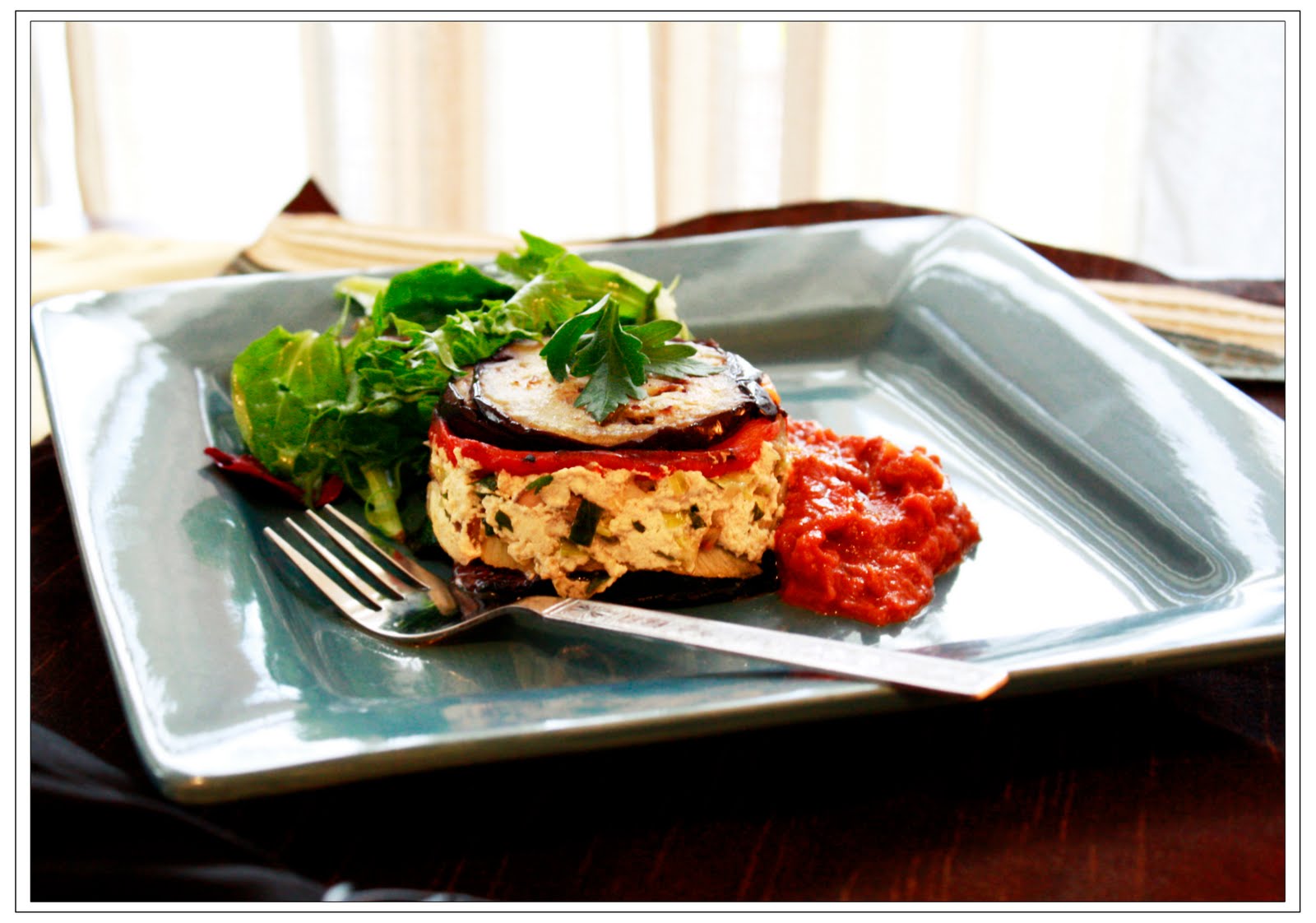With some olive oil in the pan- cook the vegetables (eggplant, zucchini and fennel) in separate batches with some salt and drain on a paper towel. In another pan sauté the leeks and mushrooms with some salt and once cooked through mix it with the ricotta cheese. Also add chopped parsley and some black pepper to the cheese mixture. Butter the sides of ramekins and put aluminum foil at the bottom (the idea is to arrange these veggies in layers and bake it for sometime- buttering the dish will help in turning the terrines out into a plate for the final presentation). Start arranging the veggies and cheese in the ramekin in no specific order but this is how I did it- eggplant, bell pepper, cheese mixture, fennel, zucchini and then eggplant again. Press it lightly and bake it in a preheated oven at 400F for 12 to 15 min. Let it cool for 3 min after taking out of the oven and turn it out on a plate. Put some sauce on the side and serve it with your favorite greens. Enjoy!