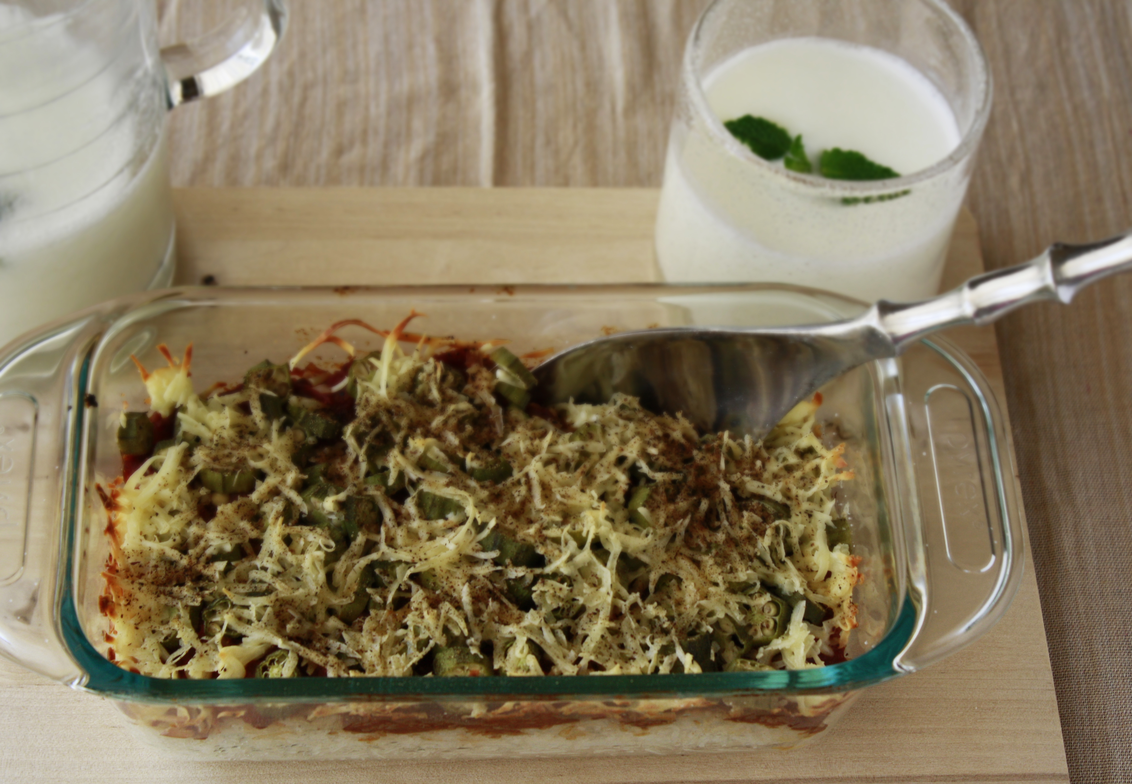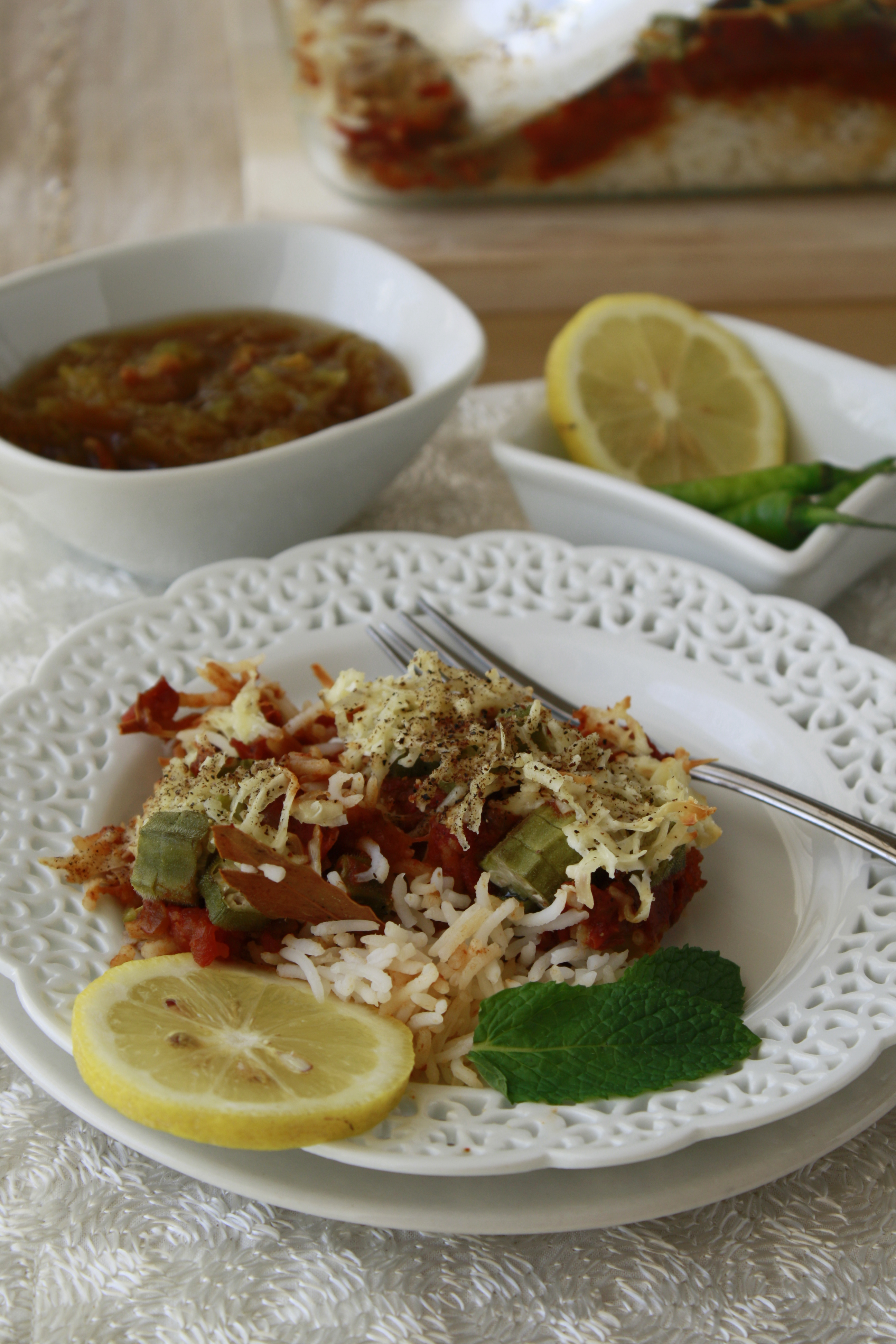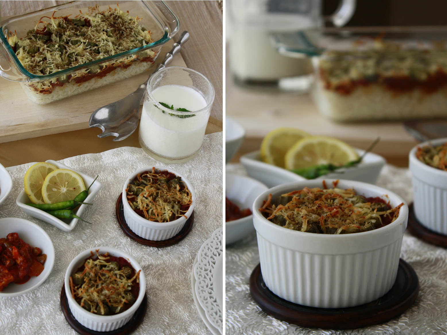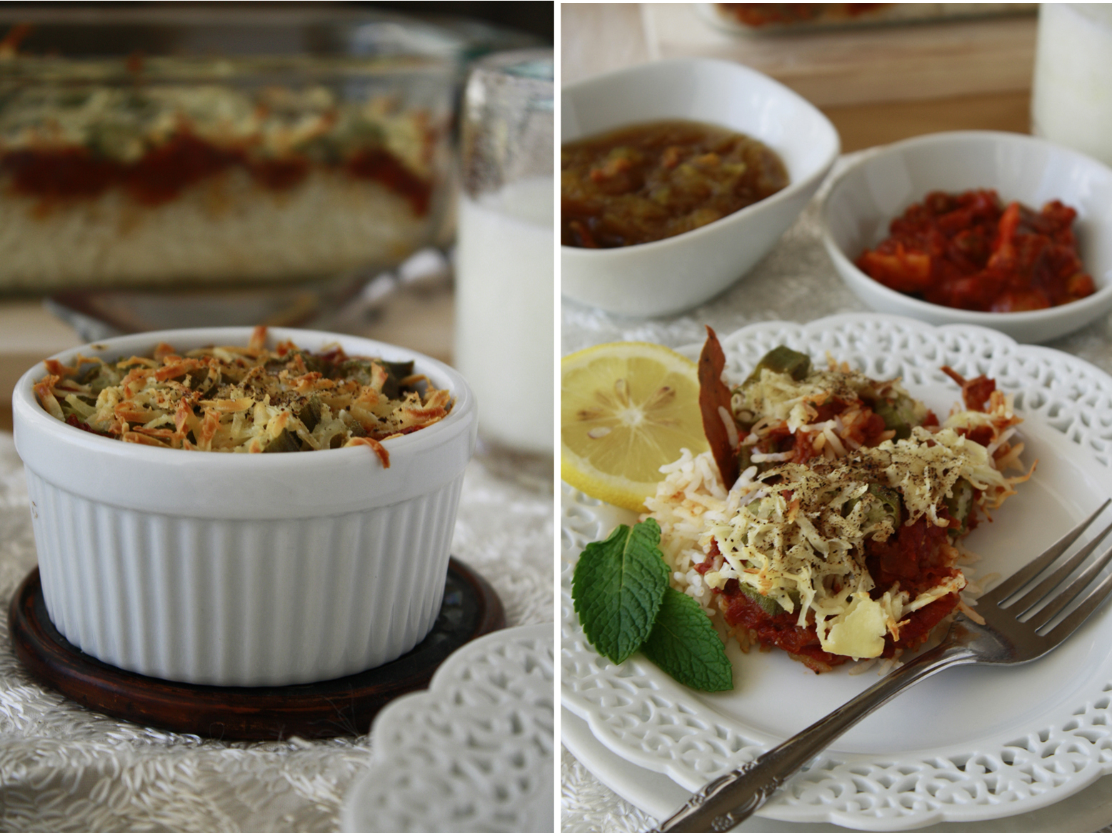 Cook rice with bay leaves in a rice cooker or in a pan. Saute onions in some oil- I always use olive oil, but feel free to use canola or any other vegetable oil. Once the onions start to turn transparent add ginger, cumin powder and red chili powder and stir for another min. Add the chopped tomatoes, salt and sugar. Cover and cook till it starts turning into a sauce like consistency, approx. 3 min. Add the tomato paste and the rest of the spices and cook for another minute or two. Add a little water if the sauce starts to get a bit too thick. In a baking dish put a layer of cooked rice, top it with a layer of the tomato sauce. Put a layer of okra on the tomato sauce and sprinkle some salt and pepper, it is important that you add salt and pepper to the okra at this stage because this is the only chance you will get to season the okra. Sprinkle the grated cottage cheese and sprinkle some more black pepper. Cover and bake in a preheated oven at 300 F for 15 min, uncover and bake for another 10 min or till the cottage cheese starts getting brown on the top. Take out from the oven, let cool for 10 min. Serve with raita, mango chutney and pickle, Enjoy!