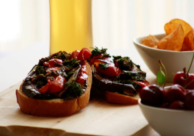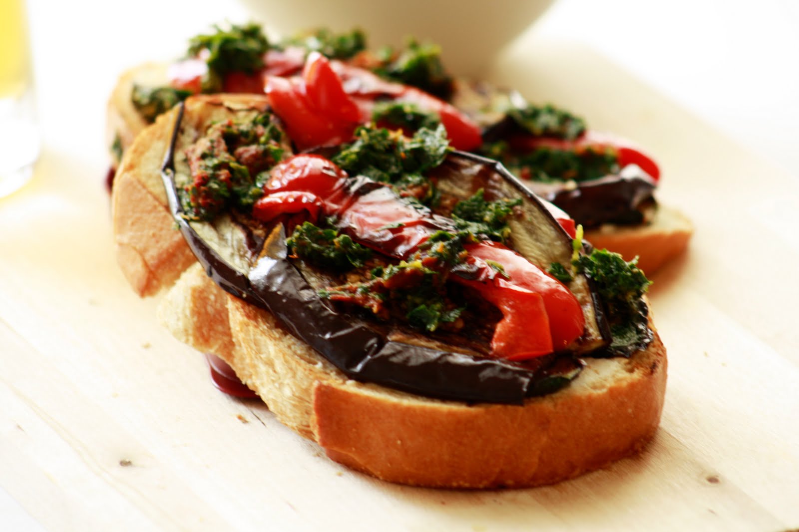 Roast all the veggies in batches in some olive oil, season them with some salt. Grill the slices of ciabatta with some olive oil on a hot pan, spread the ricotta cheese and start arranging the veggies on it in layers. Sprinkle some of the pesto and serve with your favorite fruit/salad/chips.