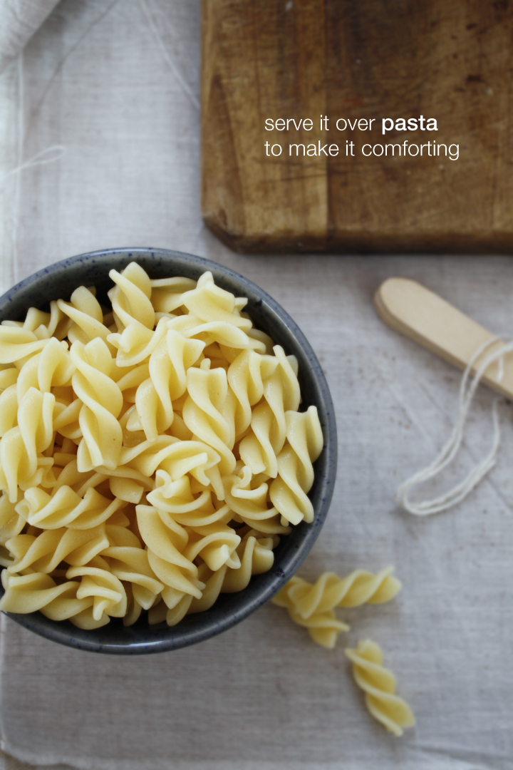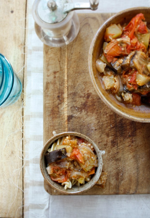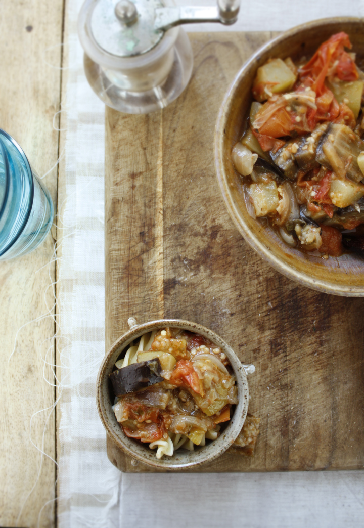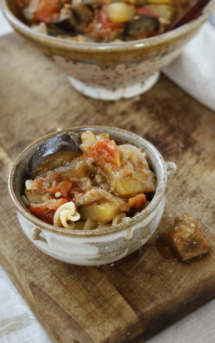 I have had various versions of Ratatouille- most of them were very thick and had a lot of olive oil in it. This however is more like a stew that Luciole said her family ate with rice. SO its chunky, has less oil and is liquidy. I served it over pasta and both Luciole and I agreed that its a perfect meal for a wintery evening when all you want to do is curl up in your blanket on the couch and enjoy a hot, comforting meal.