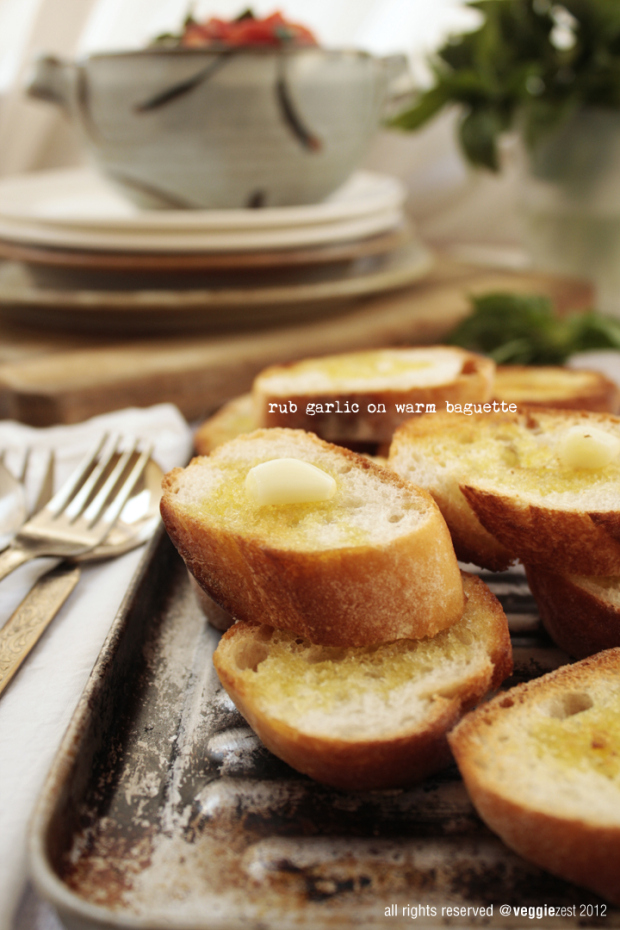 Lightly toast the baguette slices (in the oven or on a pan), drizzle some olive oil on the slices and rub with a garlic clove while they are warm. Arrange the baguette slices in the serving dish and spoon a generous amount of tomato mixture with some liquid (by now the tomatoes would have released some liquid- stir it to mix with the olive oil and balsamic vinegar). Serve warm. Enjoy!