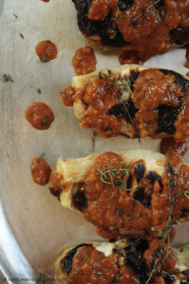 I was aiming for a sizzler-ish flavor for the cabbage. In India, sizzler is a famous delicacy at the restaurants. A vegetarian sizzler basically consists of grilled veggies dipped in bbq sauce, seasoned rice and fries over a bed of cabbage.