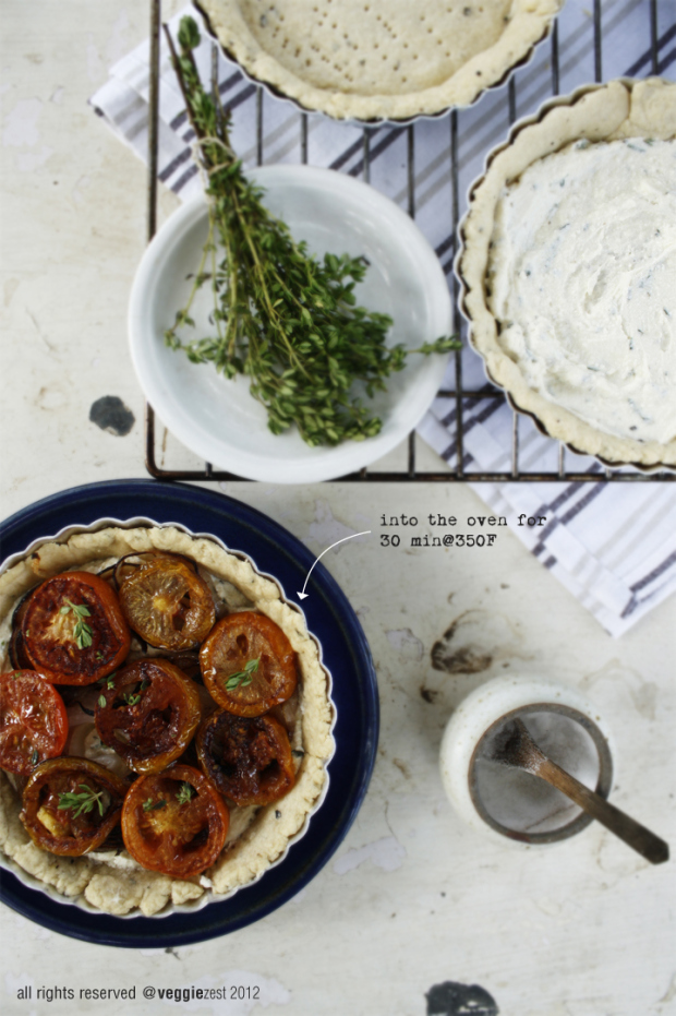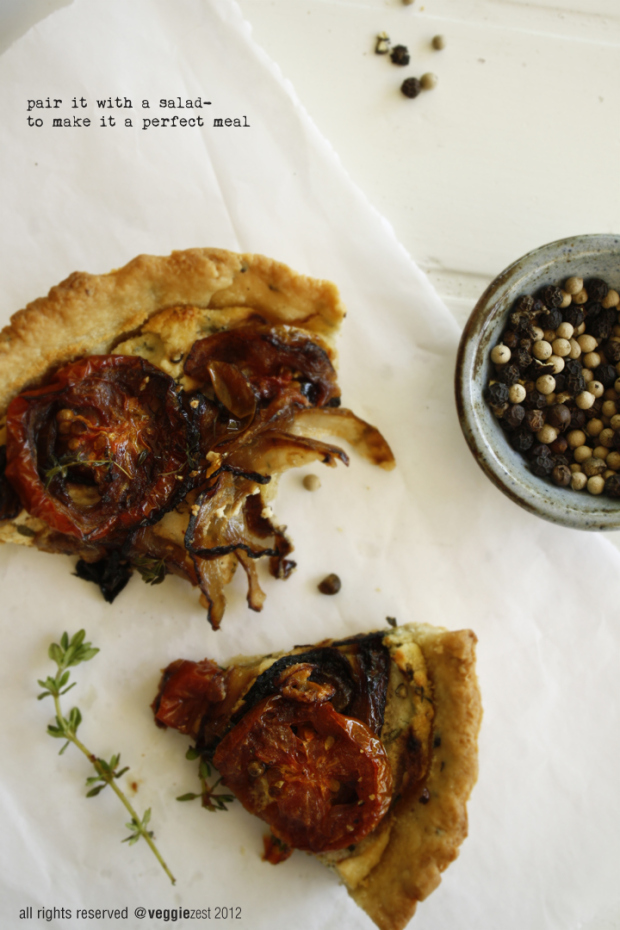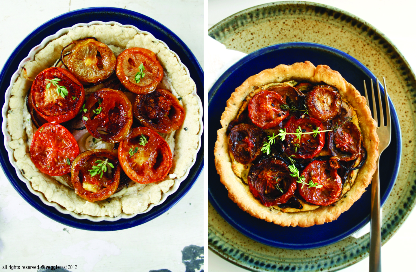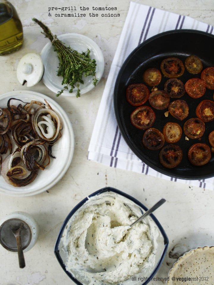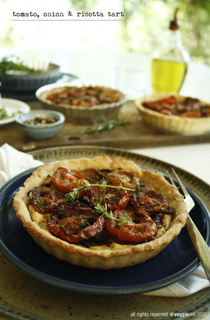 In a bowl add ricotta, olive oil, garlic, fresh thyme and some salt and mix well. Arrange the filling in the tart shell, a generous layer of the cheese mixture, a layer of onions and finally the tomatoes. Sprinkle with some salt and pepper and bake in the oven at 350F for 20 to 30 minutes.