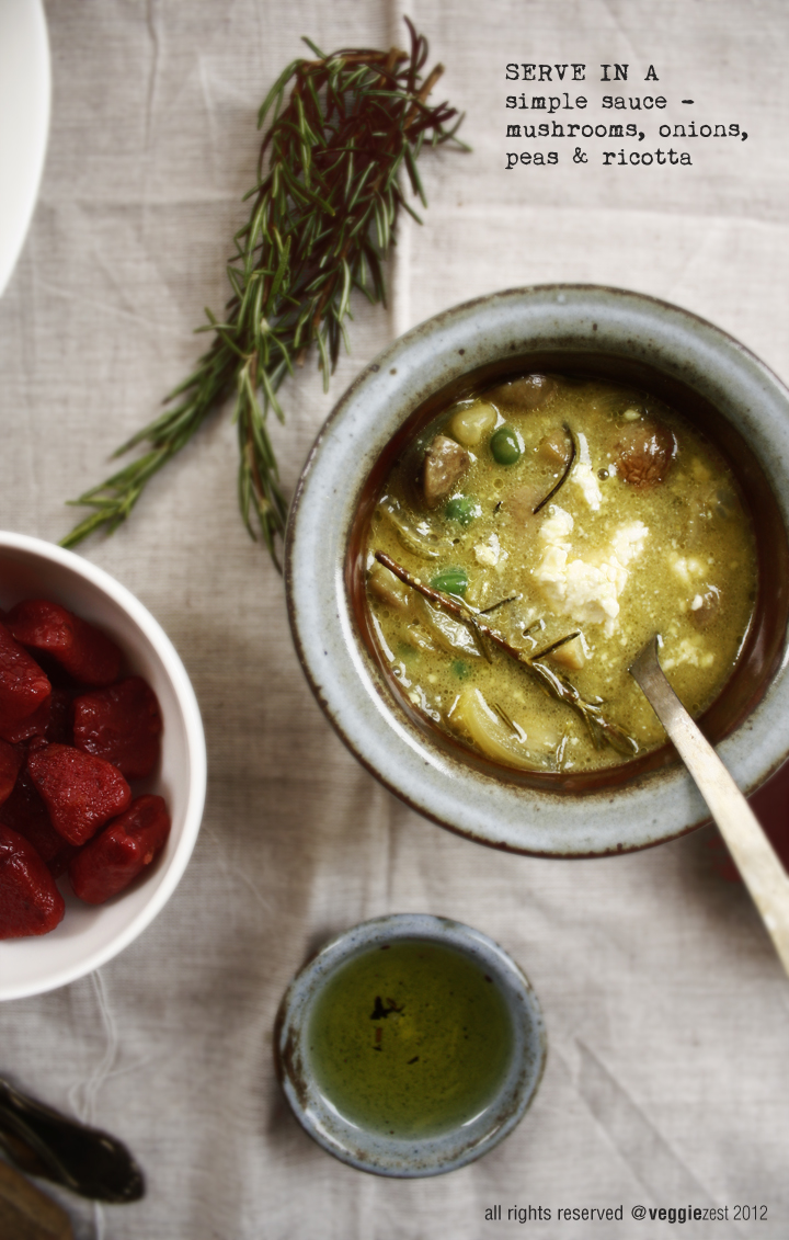 I served the gnocchi with a quick and simple sauce made out of caramelized onions, garlic, mushrooms and peas - flavored with fresh rosemary. The woody flavors from rosemary and mushroom blends really well with the sweetness that gnocchi gets from the beetroot.