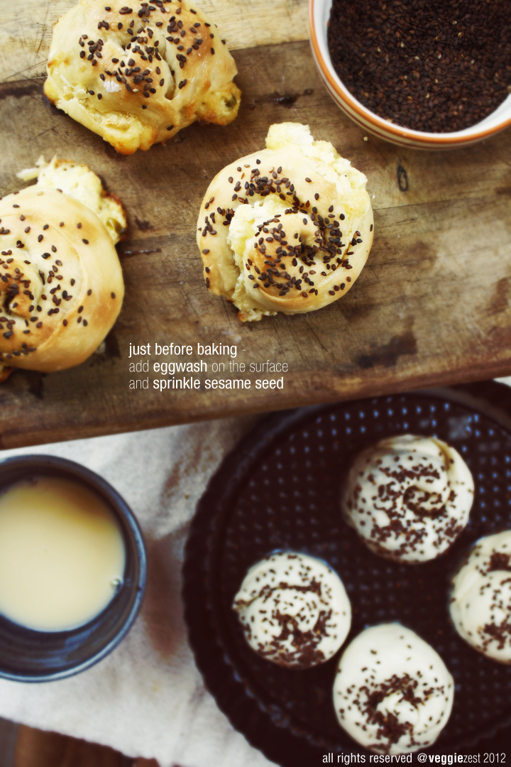 Preheat the oven at 350F. Roll out a single dough ball into 1/8 inch thick round. Arrange a heap-full tablespoon of the filling horizontally(one of the two) and slightly towards one edge of the round. Roll the round starting from the edge closer to the filling into a cigar like shape. Pinch the open sides with you fingertips. Staring from one side, roll the cigar to form a spiral. Repeat the same process with other 6 pies. Place on a baking sheet (4 inches apart), brush the top of the pies with an eggwash and sprinkle some sesame seed. Bake for about 30 minutes or till the pies turn golden.
