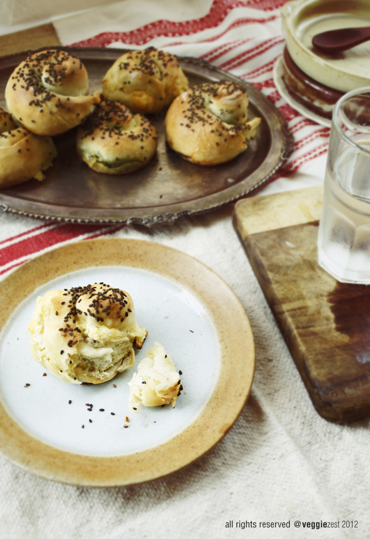 I sprinkled some sesame seed on top of these pies just before baking, sprinkling some sea salt is also a very good idea.