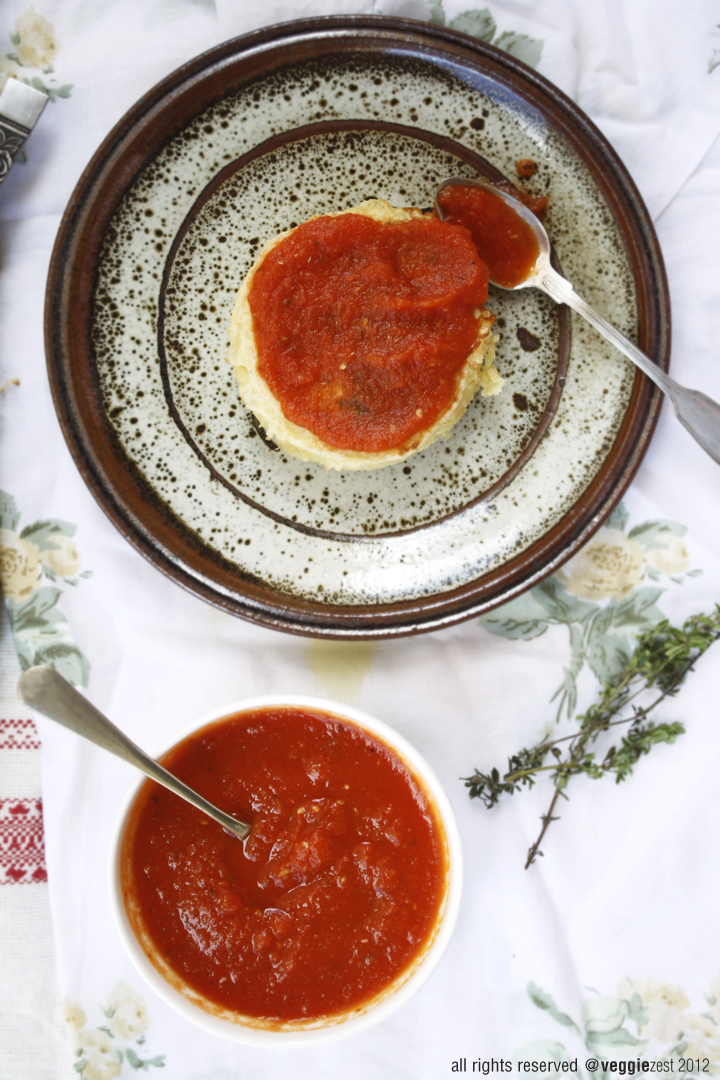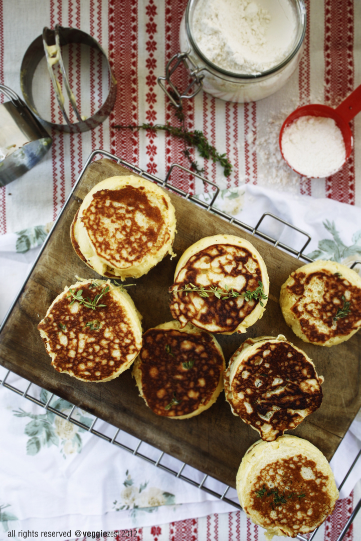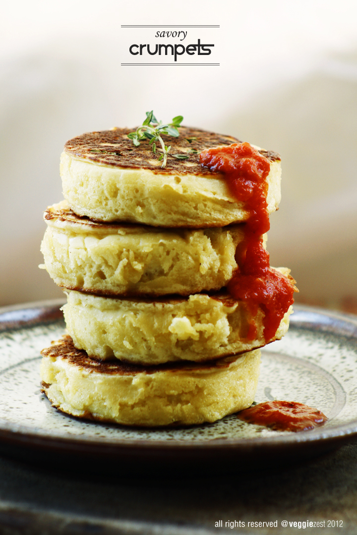 I made this recipe savory with a little variation - I added some gram flour to twist the flavor a bit and added some fresh thyme while cooking these crumpets. Later I paired them with some home made tomato sauce.